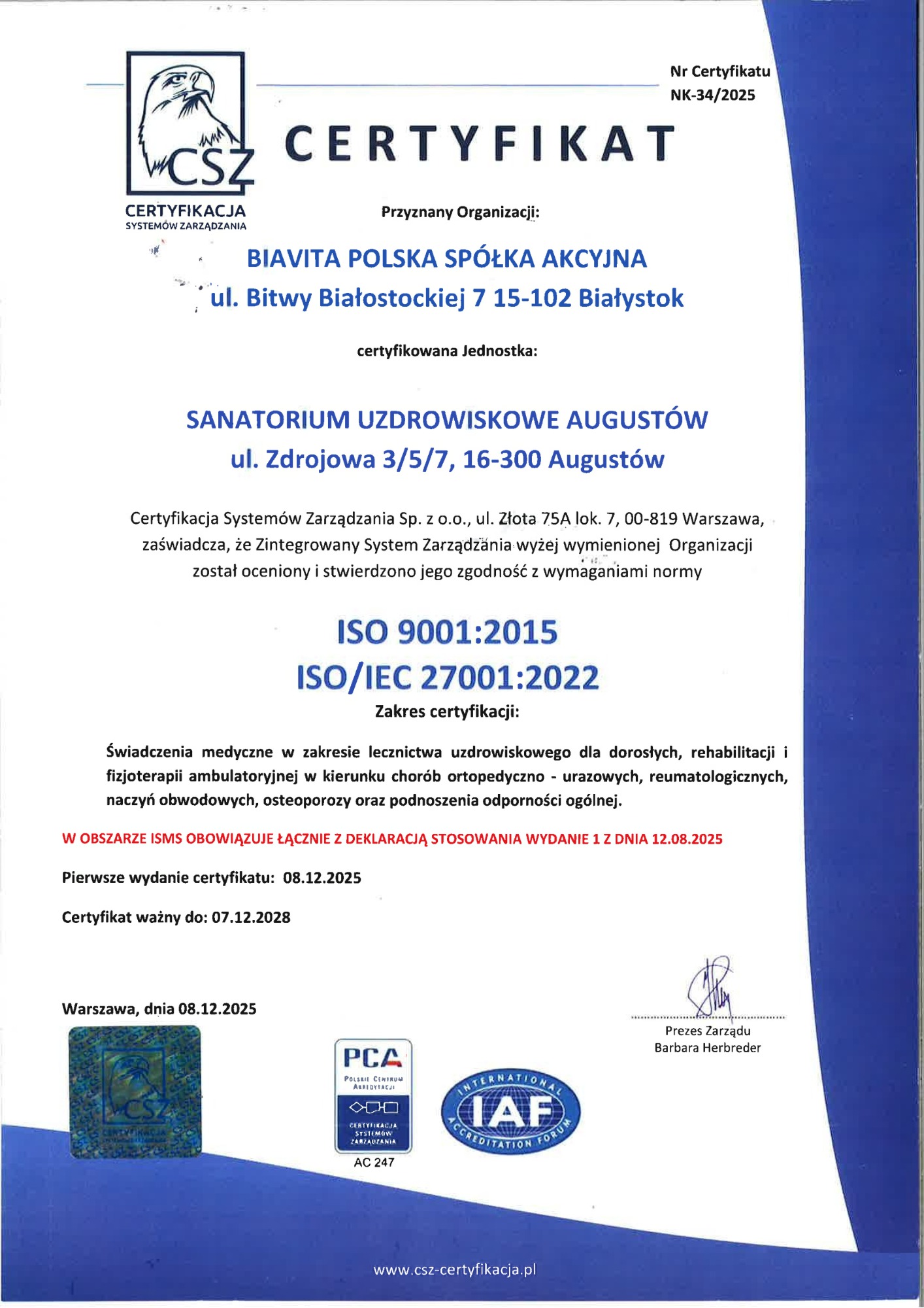 Z dumą informujemy, że Sanatorium Uzdrowiskowe Augustów Medical Spa, należące do BIAVITA Polska S.A.,